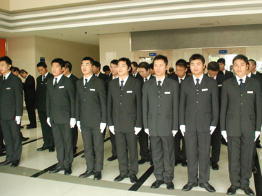 11月29日60余名擎天隊(duì)員脫下制服換上西裝,整裝待發(fā)。10點(diǎn)準(zhǔn)時到達(dá)活動目的地---“華麗家族-太上湖”項(xiàng)目地。隊(duì)員下車后排成了整齊的方隊(duì),統(tǒng)一的服裝,整齊的步伐,帥氣的面孔,響亮的口號吸引住了所有人的目光。